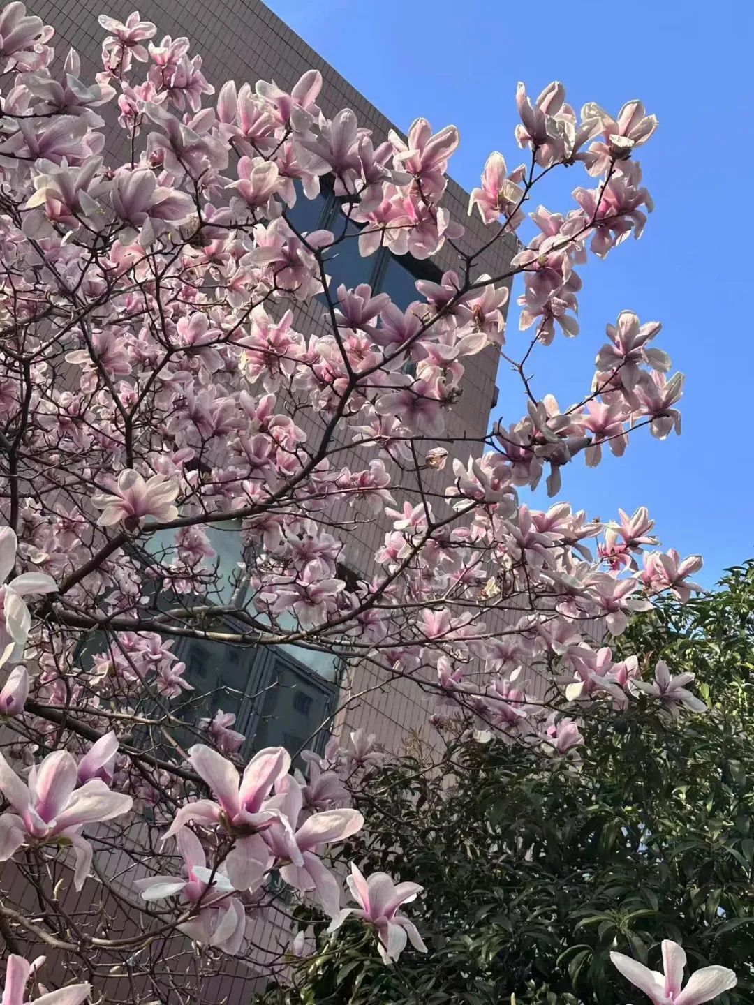 图二取景于自家小区。小区内百花齐放,这株玉兰花可以作为社区春日景观的象征。