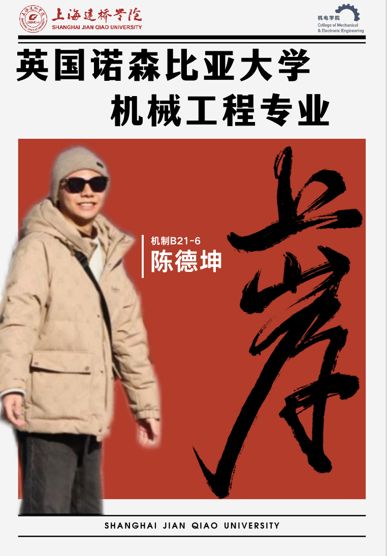 上海建桥学院机电学院2025届机械设计制造及其自动化专业毕业生陈德坤同学,以优异的学术表现和综合能力,成功斩获纽卡斯尔大学、利物浦大学、诺森比亚大学三所英国名校录取通知,即将赴英国诺森比亚大学攻读机械工程专业研究生。