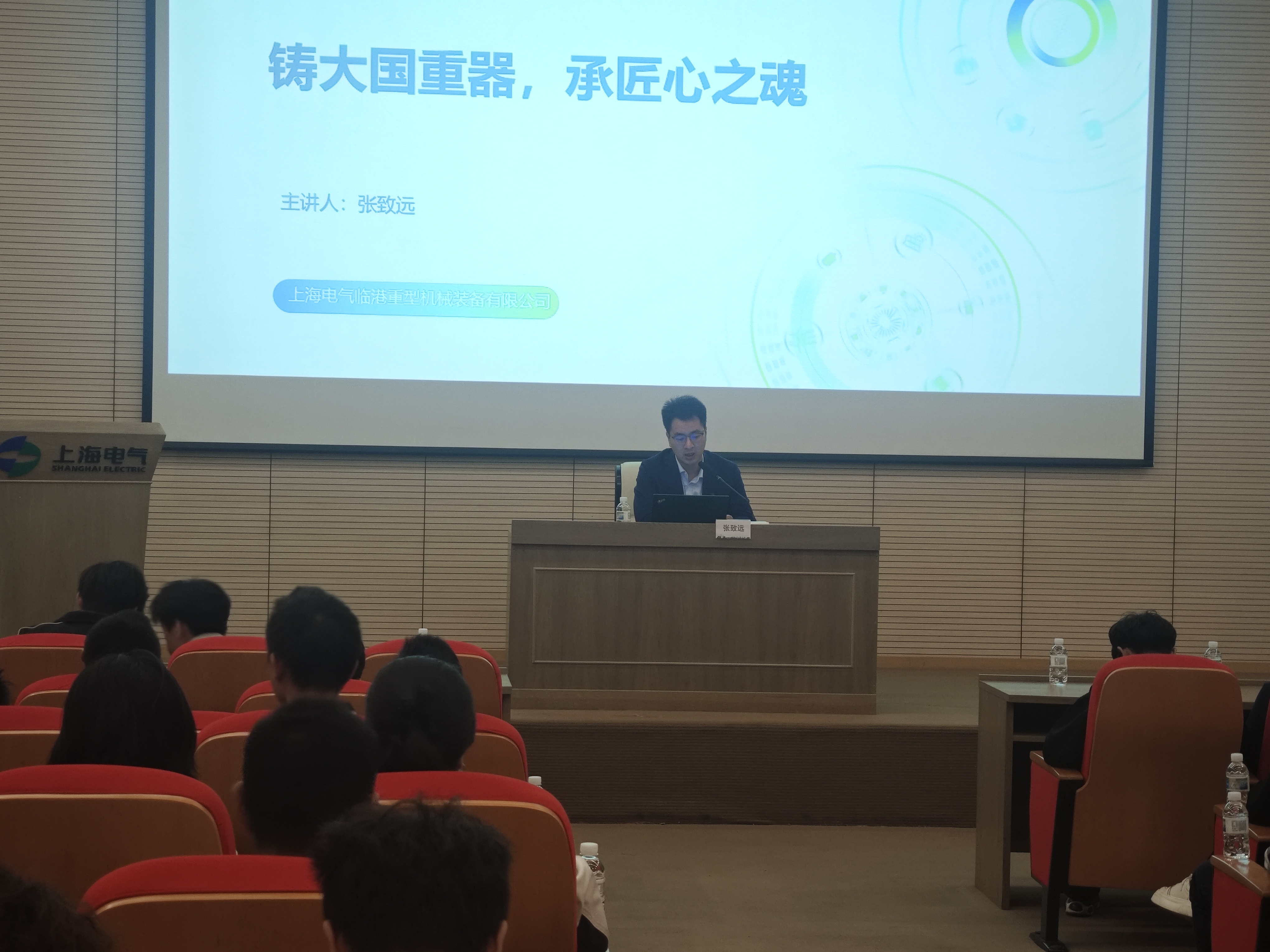 参观结束后,上海电气临港重装公司张致远书记为师生带来专题讲解,系统介绍了企业百年发展脉络以及在清洁煤电、海上风电等领域的创新成果与战略布局。他特别指出,上海电气持续推动能源装备技术革新,为国家实现“双碳”目标提供了关键技术支撑。