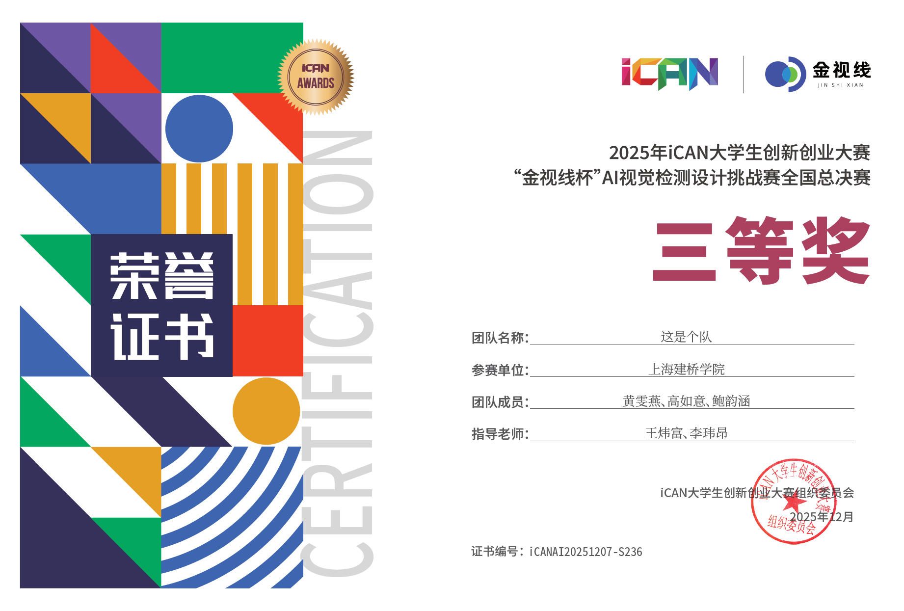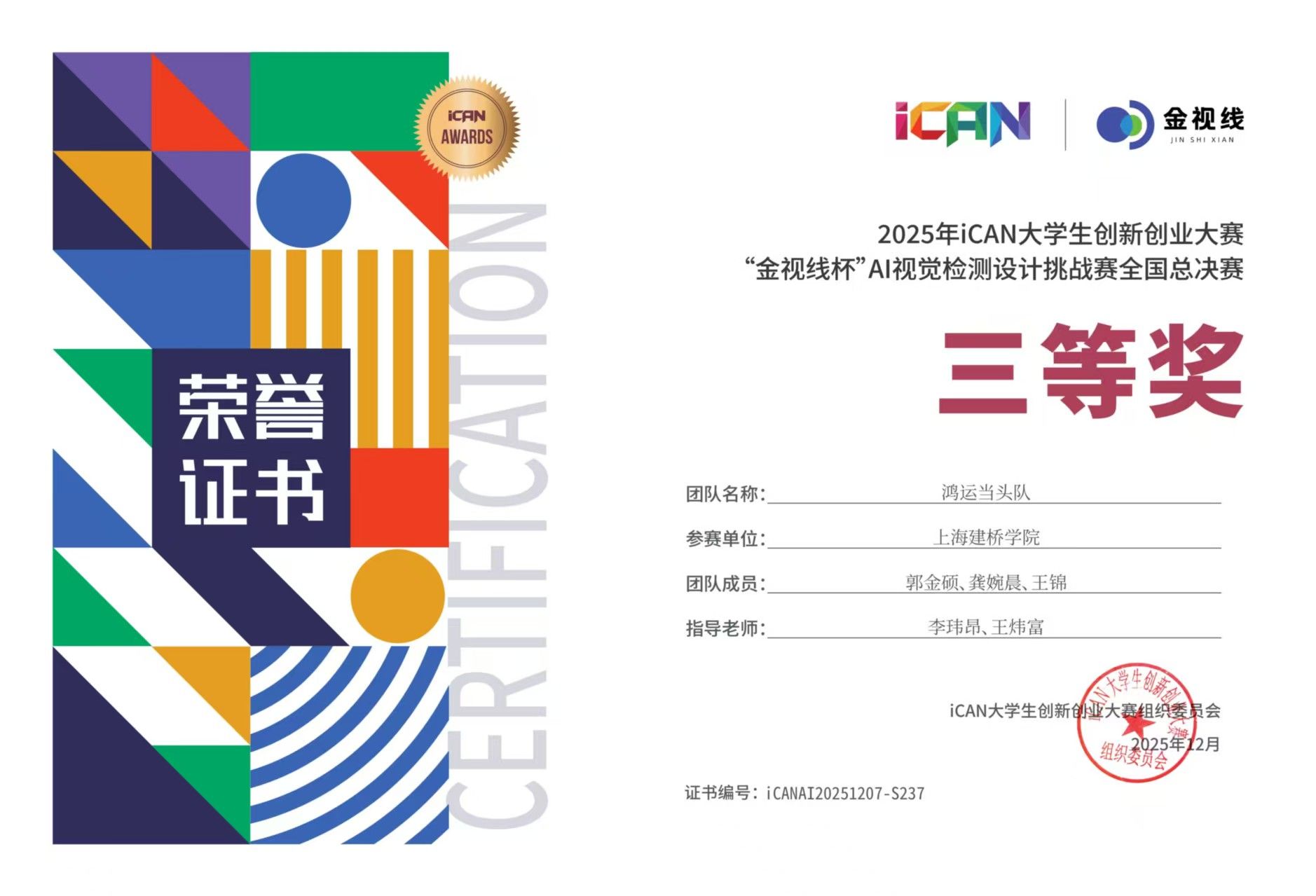 2025年12月,由iCAN大学生创新创业大赛组织委员会主办,艾瞰未来(北京)科技有限公司、北京信息科技大学、广州理工学院、赣东学院、江西农业大学南昌商学院、上海大学、杭州金视线科技有限公司承办的2025年iCAN大学生创新创业大赛“金视线杯”AI视觉检测设计挑战赛国赛圆满落幕,机电学院智能制造工程系两组选手成功获得国家级三等奖。